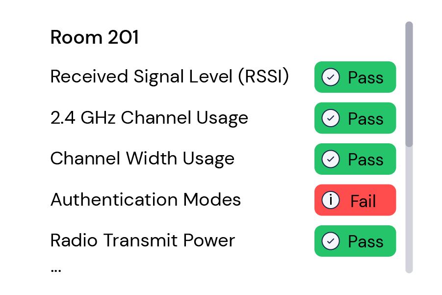 Deep Surveys automatically evaluate each location’s configuration and RF health using expert-defined profiles. Track compliance over time and pinpoint issues before they affect users.