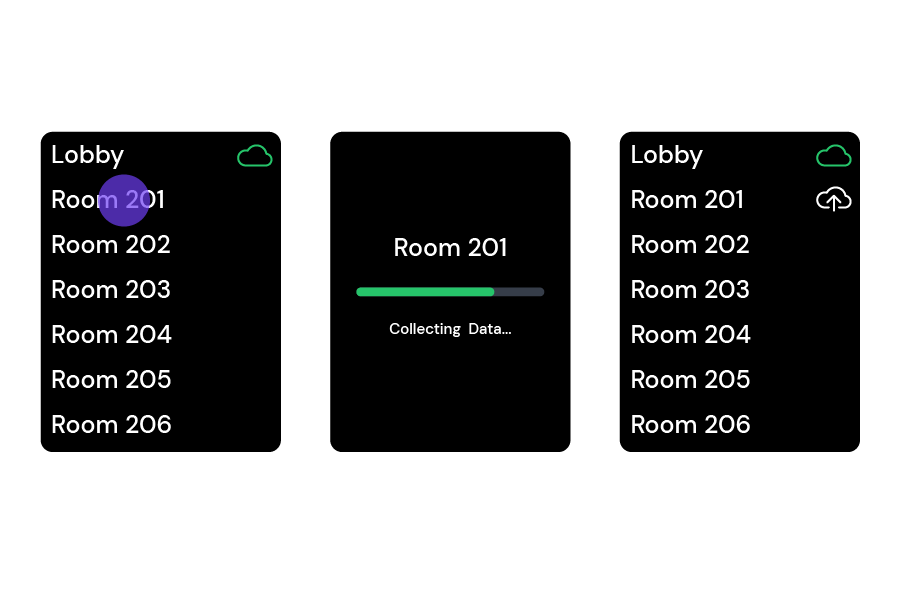 The on-site person walks to each location, taps the location pin on the touchscreen, and Sidos Wave captures a full measurement set in about 10 seconds. This continues until all assigned pins are complete.