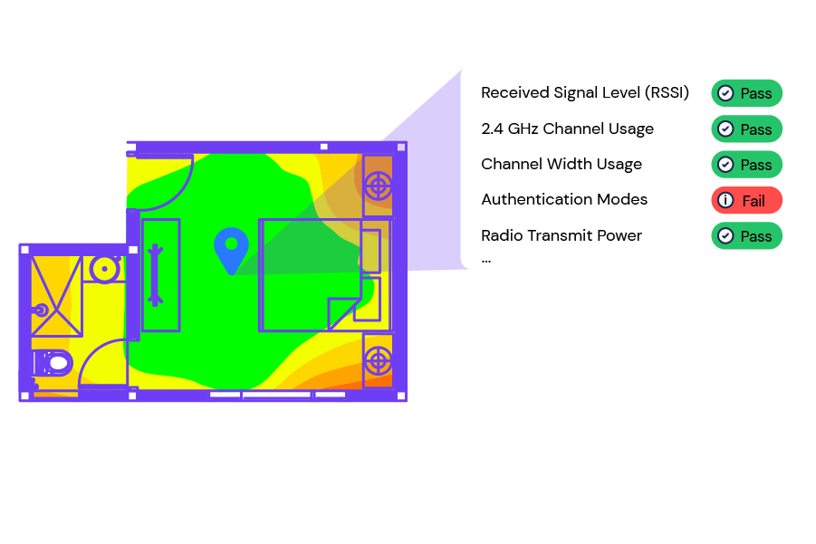 Get BSSID-level insights, RSSI, channel usage, SNR, throughput estimations, and more. Experts gain the full context they need without ever setting foot on-site.